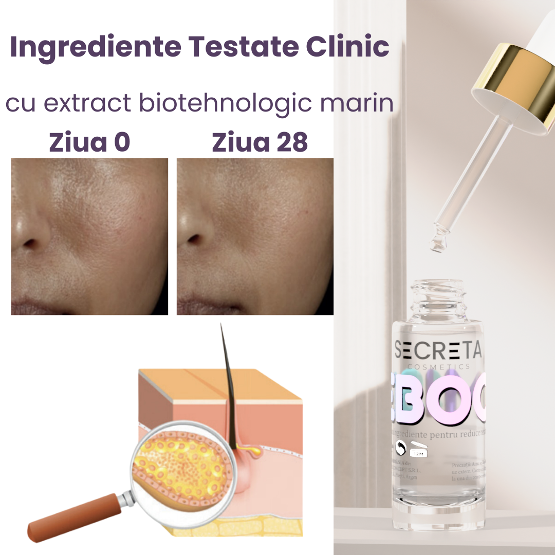 Seboom este formulat cu extract biotehnologic marin, dovedit clinic pentru a reduce imperfecțiunile și a îmbunătăți textura pielii: