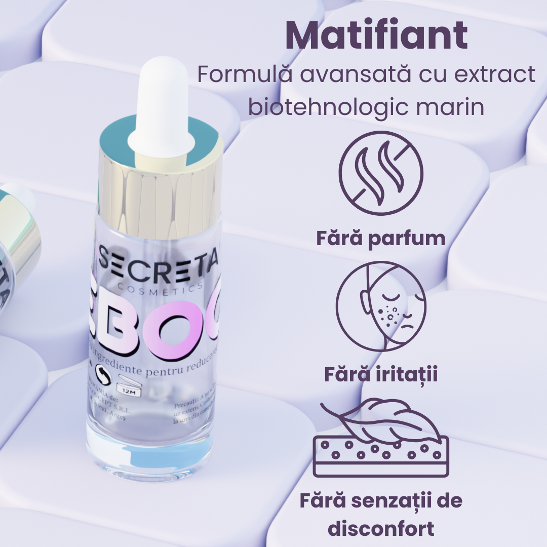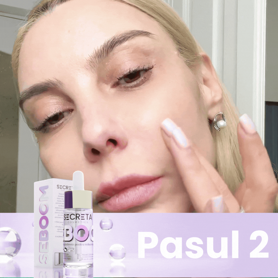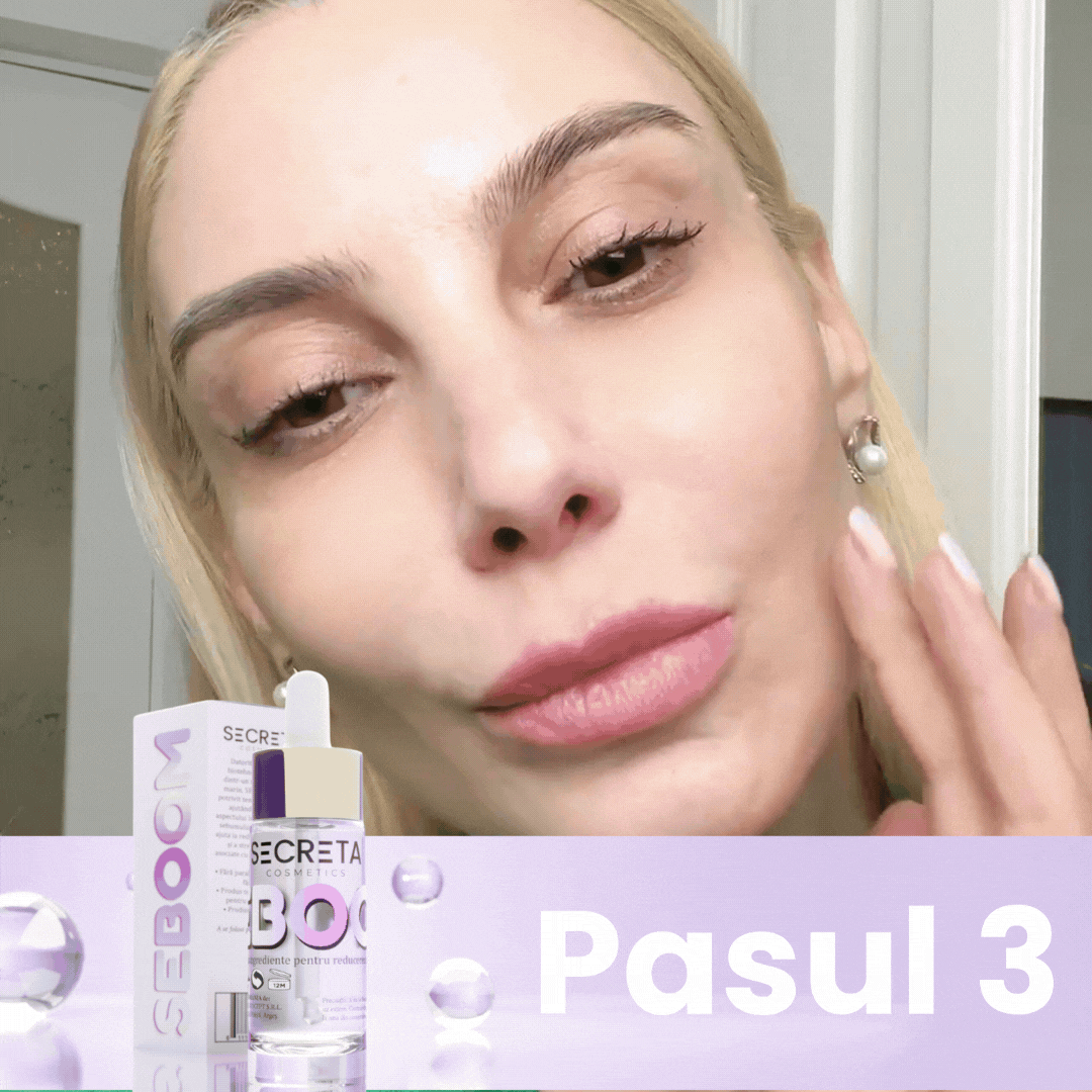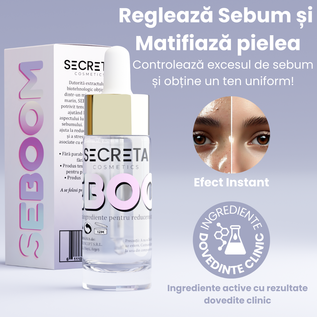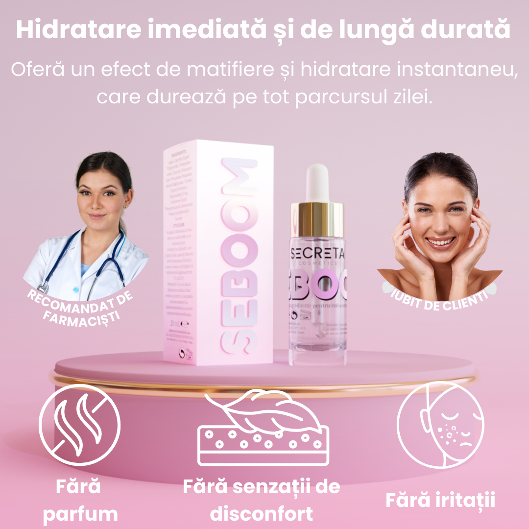 Seboom normalizează producția de sebum, reducând luciul pielii și oferind un efect matifiat care durează întreaga zi.