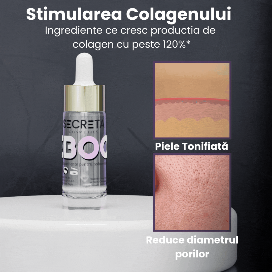 Descoperă performanța avansată a serului Seboom, formulat cu ingrediente ce stimulează producția de colagen cu peste 120%. Beneficiile remarcabile includ: